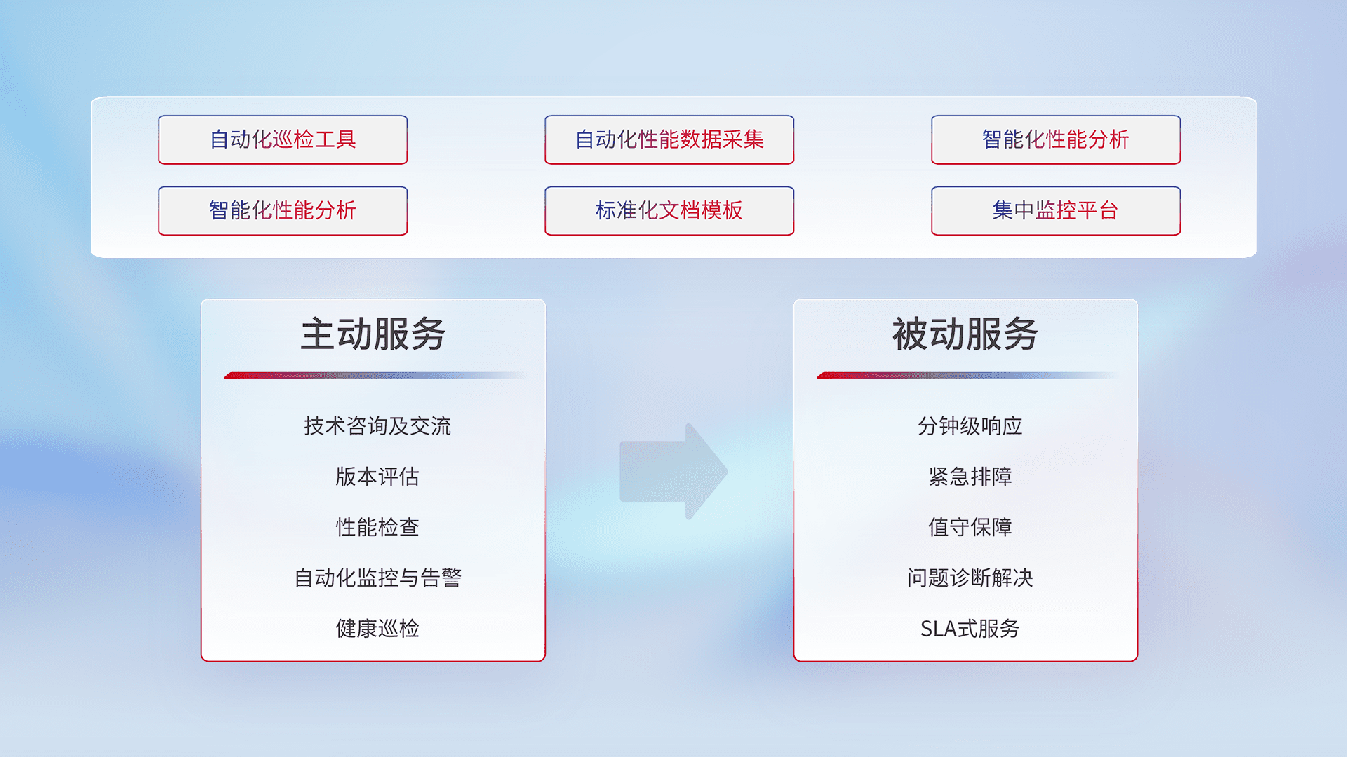 智能化工具和标准化文档,,,,保障服务质量,,,,提供主动服务(包含技术咨询、、、版本评估、、、性能检查、、、、自动化监控与告警、、、健康巡检)和被动服务包含(分钟级响应、、、紧急排障、、、值守保障、、、问题诊断解决、、、、SLA服务)。。