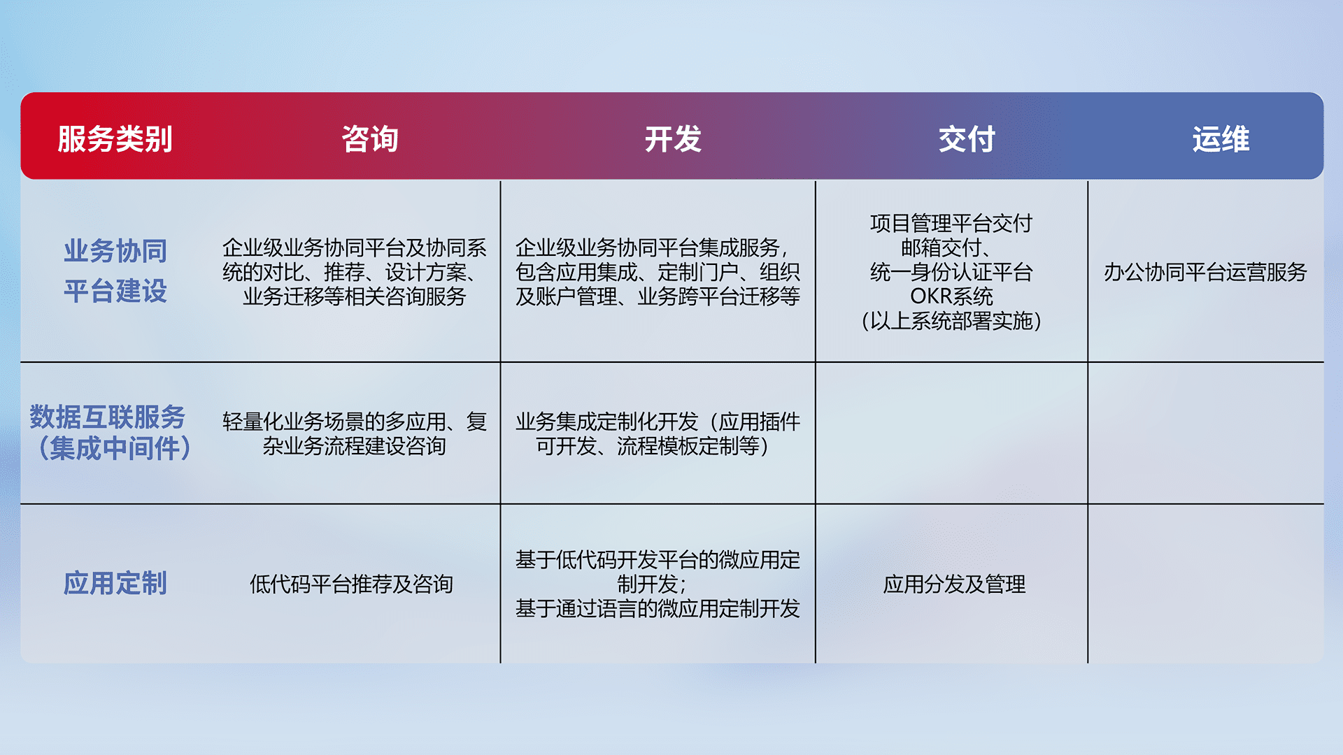 针对钉钉、、、企微、、、IDaas等平台级产品提供产品的规划、、、、方案、、、、交付、、、定制化开发等服务,,实现如统一协同办公、、智能客户服务、、、、混合会议管理、、、智能数据查询、、等业务场景,,,,实现数字化转型。。。。